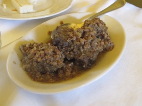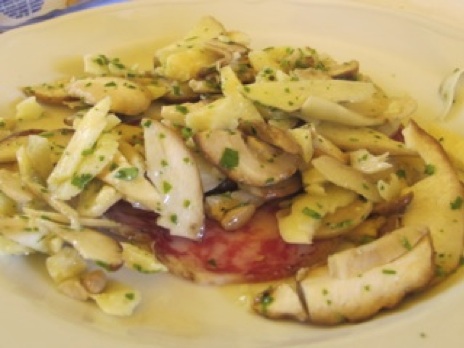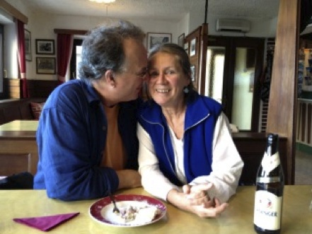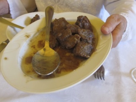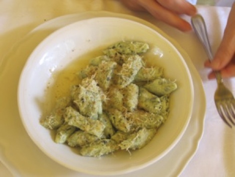 There is still snow lingering up here at this altitude. We have a wonderful meal of local dumplings in mushroom sauce. The dumplings are made with a lot of bread crumbs, with parsley , speck and sweet corn niblets. They are very warming and filling up at this altitude. Love from the foreign Contadini.