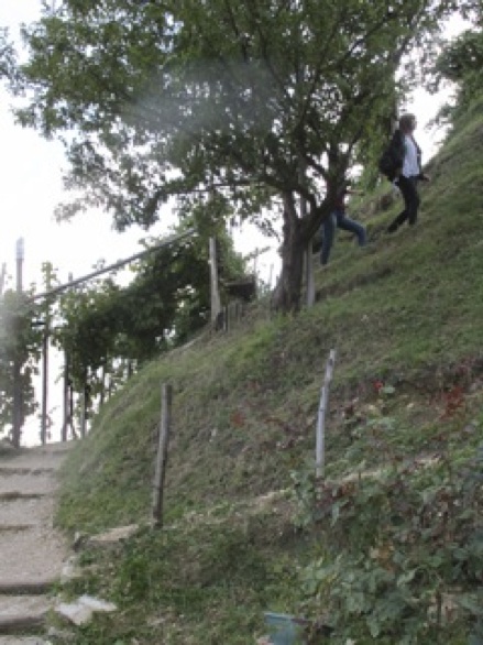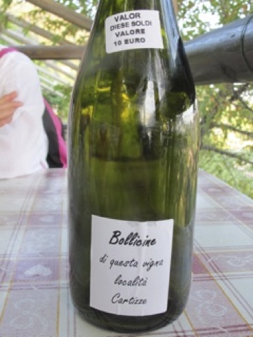 The local prosecco, which is very good. Ameretto tarte and Semi fredo ice cream and a ‘corrected’ cafe to finish. The Italians like to ‘correct’ their coffee, so as to aid digestion after lunch. This ‘correctivo’ coffee is very agreeable, the ‘correction’ being a shot or two of grappa. We must drive back to the main road and down into the valley again to look for the special winery that has been recommended to us. We eventually find a very small sign. Tucked into a bend. We can’t park anywhere near the lane-way leading in because of the harvest and constant trail of tractors and grapes making there way into the various wineries. We find a park in another place, precariously on the side of the hill, where the road is just a little wider, so that there is room for us so that the tractors to pass. Luckily we have a very small car. We walk all the way back and up the track past the tractors and their precious sticky, dripping cargo. Past all the building work, extending the winery for next years harvest. As this is Italy, it was supposed to be ready for last years vintage, but still isn’t finished yet. We have been told of this small producer, who has his vineyard on the side of a cliff and that you can walk to it. There is no-one there through the day, and you can go there, perch yourself on the side of the mountain by the old rustico, go in and select a bottle of his best prosecco from the fridge, pay 10 Euros into the honesty box, help yourself to some glasses from the stone ledge near the tap, then find a good possy on the cliff edge to sit, drink, contemplate and solve all the worlds problems. It works for us!. After an hour and a couple of bottles, we don’t have any problems.
