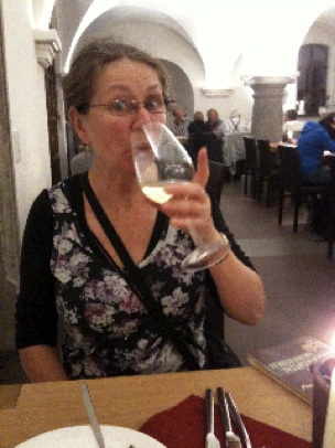 Now when I think spital, I’m not thinking food, especially when merged with the concept of the sick and the dying in the middle ages. But this place is wonderful, so atmospheric and beautifully lit. In among the low masonary arches, it has been well worth the half hour walk through the town in the rain. Mercifully the rotund frau who is on tables speaks ‘waiting-on-tables’ english, which is 1000 times better than our ‘being-a-customer-in-a-restaurant’ German. So that’s great and makes it so much easier than having to guess what we are going to eat. Although it removes some of the element of surprise. We ask her for something special and local to the immediate locality, she recommends the veal. Lets face it, I’ve just had veal. I’m not so sure I can face up to another dish of Daisy’s vista. but she cleverly describes how the chef has slowly baked the eye fillet in a bread pastry casing. I’m in. The crispy pastry reveals a soft rare pink fillet which melts in my mouth, with lovely sauce and vegetables. So much for being vegetarian. Janine takes the veal fillet wrapped in bacon. this time it is her turn to try the vealler and schwine combination. but this time the various parts of the respective anatomies are reversed. Her meal is served in a very rich chatterelles and cream sauce. Yum! Not only is hard to be vegetarian, but also stay low in saturated fats. We decide on another local riesling, this time from the hillside above the town grown in almost totally chalk gravel by a Herr Hageman. It is lovely, full of flavor, yet still dry. Janine tries the Bailey’s cream, cream-broulle and I decide to clog my heart further with the Roguefort and pears. A meal to die for, or because of!