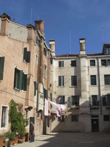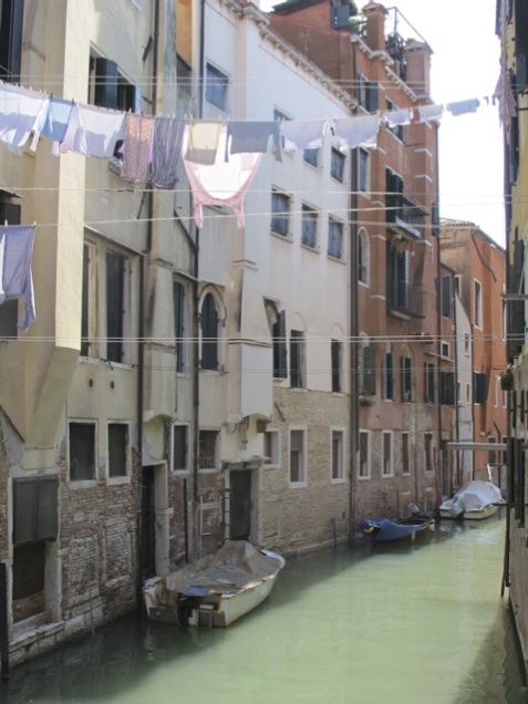 I make a 1 minute video of the tide advancing across St Marks Square. It crosses one paving tile in that time. The workers are putting out the elevated walkways. The other tourists are queueing. I measure the Depth in Venice of the rising tide. We disappear into a lane way and off to a small church, then a longer navigation back to the grand canal at the very tip of the point and back along the Grand Canal past the Grand Palazzos from their water frontage face, we stop off at the Guggenheim for a few hours. We are getting Deft in Venice at leaping on and off the gondolas’ and vaporettos’ Deck in Venice as we pass along the canal. We head back into the back lanes and small streets. The old ladies are washings their clothes and hanging them out on the high clothes lines over the laneways.