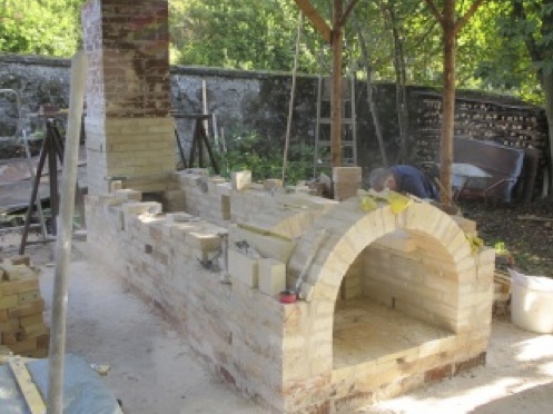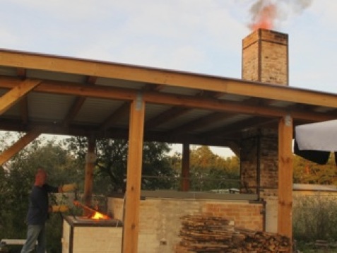 Germany We met up with the German potter Markus Bohm at the conference in Guldagargaard and got a lift with him to Alt Garrzs In north-east Germany. He employed me to design and construct a kiln for him as a workshop, organized through the local ‘Kalkspatz’ ceramic organization, who funded the whole thing. Markus wanted our particular design modifications that utilise the downdraught firebox (Bourrybox) For his wood fired kiln. Markus had bought my wood firing book online and we had entered a long email dialogue about the kiln and it’s design before we left Australia. I have been building this kind of wood fired kiln for almost 40 years here in Australia. I borrowed this innovative design concept from the French, who originated it in the 1800‘s, I have developed it into my own version, one quite different from the original, and I believe, much improved. We are now being employed to hand it back to Europe to see what they do with it. The great beauty of this design is that it is very efficient, clean, easy to fire with minimal physical effort and it can deliver an excellent decorative ash deposit on the pots, if you let it. This firebox can be a very efficient and powerful heat source for firing pots and has been adapted to fire all sorts of kilns in it’s time. Since the 1970’s I have spent a lot of time developing the potential of this firebox concept in my own idiosyncratic way, The principal involved is one where the wood is burnt up in mid air, suspended on brick hobs and the flame travels down into the kiln chamber. With the burning wood suspended up in the air, the ash from combustion falls down and is delivered into the gas stream of flame and air, which allows the ash to be carried well into the kiln without any extra agitation being required. I’ve heard some potters say that the bourry box doesn’t deliver much ash to the pots. Well it will if you let it. My work with this design has concentrated on developing a smaller, compact and easily managed, elegant firebox. I have found that the firing experience can be very quiet, calm and civilized with most of the time spent sitting watching the firebox work. Stoking cycles can last up to one hour between stokes where larger pieces of hard wood are used. This makes for a very laid back firing experience. Of course, this kind of quiet, calm, ‘nothing–much-to-do-but-watch-it-work’ for long periods kind of firing isn’t for everyone. There are times when one hour goes past and I don’t ever get out of my chair, as there is nothing to do. The kiln just goes on firing and climbing in temp and the wood just keeps on burning. Any intervention would be a mistake when everything is going so well. I like this kind of firing. But there are those who feel that they must do something, to make their mark on the firing, they interfere with a perfect system, bring it undone and then start to work hard to rectify what they’ve ruined and end up spending a lot of time and energy to fix what wasn’t broken and claim that they are a genius for getting it to temp, when it would have happened quietly and calmly without them. I have developed a firebox and kiln chamber combination that encourages a lot of ash onto the pots without the need to rake and flick the ember pile to get the ash onto the pots, as is necessary with an anagama style kiln. In my kiln there is a place for heavily ashed and carbon and ember included pots and another for more delicate flashed and lightly ashed pieces. The ‘cut-n-come-again’ magic puddin’ kind of kiln. Another great advantage that this firebox offers is that it doesn’t need to make much smoke, especially during reduction, while producing these results. I like the cleanliness and efficiency of it. It suits my philosophy and life-style choices So this is why Markus employed me. We had been in email contact with Markus since he purchased my book ‘Laid back Wood Firing’ a few years ago. We met up with Markus when he visited Australia in 2008 for the Sturt Woodfire Conference. It was here that we started a dialogue which culminated with us going over to Germany and building his kiln amongst others. This kiln was specifically designed as a small, quick-turn-around salt kiln to augment his already existing larger, forced draught wood fired salt kiln of 3 cu. m. Markus’s brief was that the kiln should be approximately 1 cu. m. in total capacity, be easily fired in one day from morning to night, be capable of delivering good decorative ash deposit onto the pots, be constructed of materials that resist salt degradation and to be as fuel efficient as possible given the other requirements. Salt kilns are usually built of quite heavy and dense high alumina refractories so as to resist the corrosive effects of the salt vapor at high temperatures. Markus favored the use of castable refractory as a hot face lining for the chamber. Castable refractory is a kind of special cement that is mixed with water like ordinary cement, but after it is set, it can be fired to very high temperatures and becomes a special kind of refractory, unlike ordinary cement, which will just melt into s liquid. Fortunately, I pioneered the use of castable refractory lined salt kilns here in Australia back in the seventies and had built a considerable number of them here. (Pottery in Australia, Volume 14, Number 1, pages 26 to 30. 1975. “A calcium-aluminate cast kiln for salting”.) Way back in the dim dark ages of the seventies, I started augmenting my livelihood as a potter by building kilns for other potters. Salt glazing was quite popular at that time, more so than it is now. I realized that castable refractory had all the requirements for building very long lasting salt kilns. I first saw it used by a potter who I worked for after I left school. An amazing potter, called Mike Pridmore, who was entirely self taught. Mike had used this stuff to build his gas kiln and this is how I first became aware of it. Consequently I 