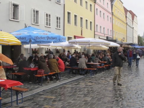 On the way up we pass a multitude of antique shops all selling what I call shlock. It’s all guilted, gold plated and overpriced, I’m underwhelmed. We continue up and find a lovely little 2nd hand shop, all the things are very cheap, possibly because it was such a strenuous walk up and away from the town centre to get there, perhaps not too many tourists get this far. We buy a translucent porcelain cup and saucer for 12 Euros. Good value. Proving that it’s a long way to the top when want to shop and stroll! We leave Meissen and drive a few hours to Regensburg where we can’t find lodgings in the old town centre, which is charming and ancient, but booked out. We start to feel that our luck is against us, it’s started to rain and there is nowhere to park, when suddenly, we pass a ‘washerie’ or Laundromat. These are as scarce as hens teeth here in Germany. It’s the first one we’ve found. There are a few dry cleaners, but no self-serve Laundromats. Washing usually has to be booked in the day before and collected a day or so later and a price per item is not uncommon. We suddenly feel blessed again. We do all our washing and drying for Eu4.50 and there is miraculously a parking space opposite. As we can’t find a pension in the town, we move on to a nasty hotel on the highway a few km out of town, which is the only room we can find here on a Saturday night where everything is booked out. We are used to this. As we travel very lightly and without a fully pre-conceived plan. We have no forward reservations, so we travel by the seats of our pants. It’s not uncommon to find it hard to get a room on a Saturday night, but we always do. We get the last room in this soulless highway hotel. We decide to do the 3 km walk back into town tonight along the canal, where the barges are queued up waiting for the lock. It’s raining lightly and we feel our luck has run low again, Or are we just very tired? I don’t know, but as we approach town, we pass through the old medieval aches of the ancient buildings along the lock. One of which has been converted into a brewery. Regensburg Spital Brauerei. Situated in the old hospital buildings. We emerge through a stone archway into a side street that ought to go directly into the main road, but tonight its Saturday night and the street is closed to traffic and there are a multitude of stalls selling hot cooked regional food, beer and wine. It’s a well kept secret and it’s absolutely terrific, all the flavours, smells and tastes of the region, and we didn’t know that it was here. We are lucky after-all. We sample the wares from several different stalls, First the local ‘Spital’ beer, then the dry, fruity, white Rieslings. Next, the the local reds and so much food. It’s a great night. There is live music from rock and roll through brass bands to Bavarian folk muzik played by men in leder hoisen and red vests. It’s great, and it’s stopped raining by the end of the night too. It’s a lovely quiet walk home along the canal.