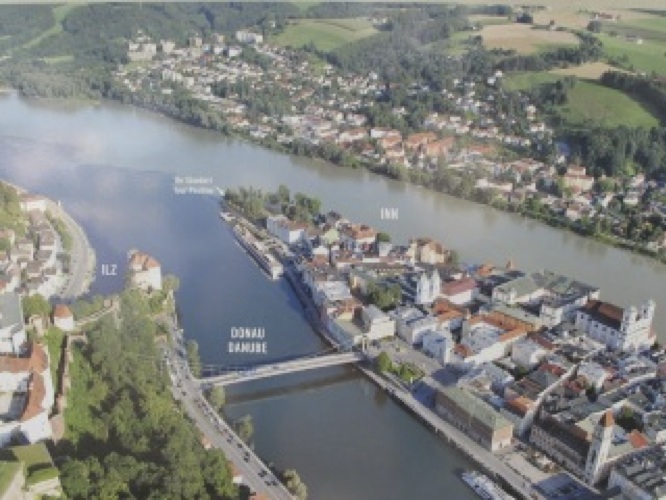 Our time here has been all very lovely and relaxing. So now my fingers and my brain have stopped bleeding. All my clothes are washed clean and dried. Everything is working out well. The heavy metal goths stayed up till all hours making a din, but finally went to bed at dawn. When we got up we see a ‘do-not-disturb’ card on their door. They need to sleep in!. I feel like taking it off! But I don’t want the house maid to suffer by waking them. We are slowly letting go and slowing down. I feel good today, even allowing for the lack of sleep. We feel so good, we decide we can manage the Kathe Kollwitz Museum of depressing character studies. It’s unrelentingly dark. She was very passionate and talented, but you have to be in the right frame of mind to spend half a day in there. Here we are in Passau, a little bit further south west. In fact as far as you can go in Germany before entering Austria. We are at the confluence of the Danube, which isn’t blue! The Regan or Inn and the Ilz. None of them are blue, all are various shades of dirty greenish/brown.