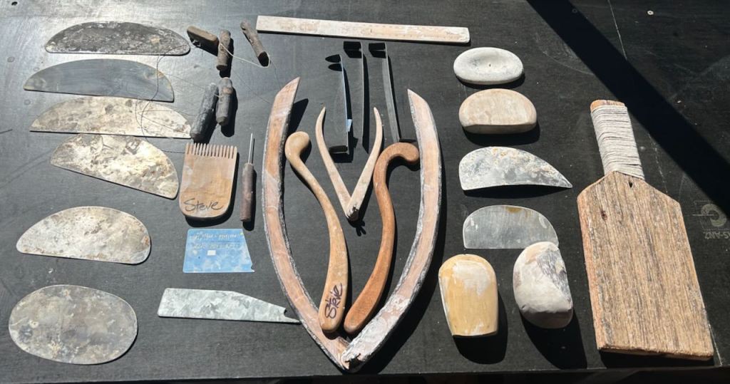 For this workshop, I’m planning to demonstrate making a range of simple tools from throwing tools and profiles, to turning tools, paddles, small callipers and stainless needle tool, turning tools etc.